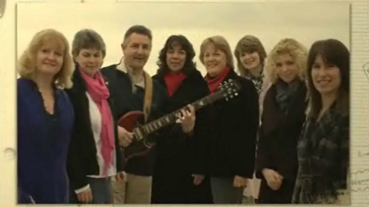 Hanes merched Ysgol Penweddig, a Bernard y cynorthwyydd Ffrangeg, a ganodd mewn grwp pop y Steddfod. Tracing pupils from Penweddig School and Bernard the French Assistant to retake a photo.