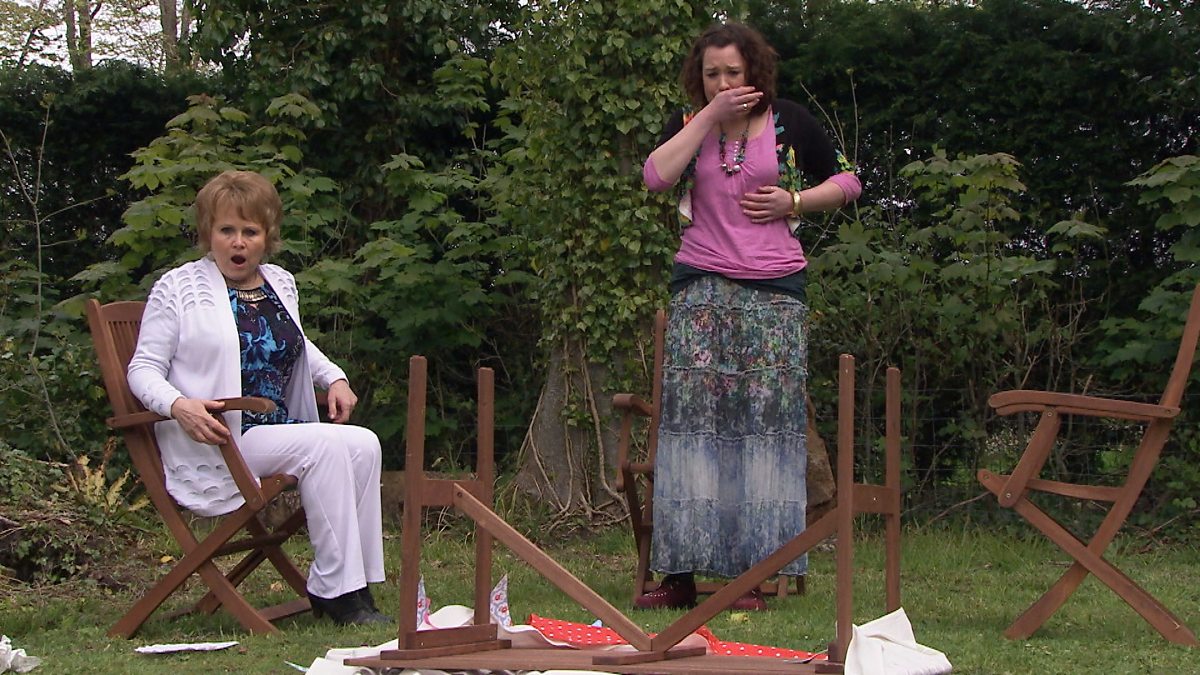 Mae Gemma yn bwrw bwrdd picnic drosodd gan ddangos ei rhwystredigaeth. Gemma takes her frustration out on a picnic table. Why is Eifion driving Ed's taxi?