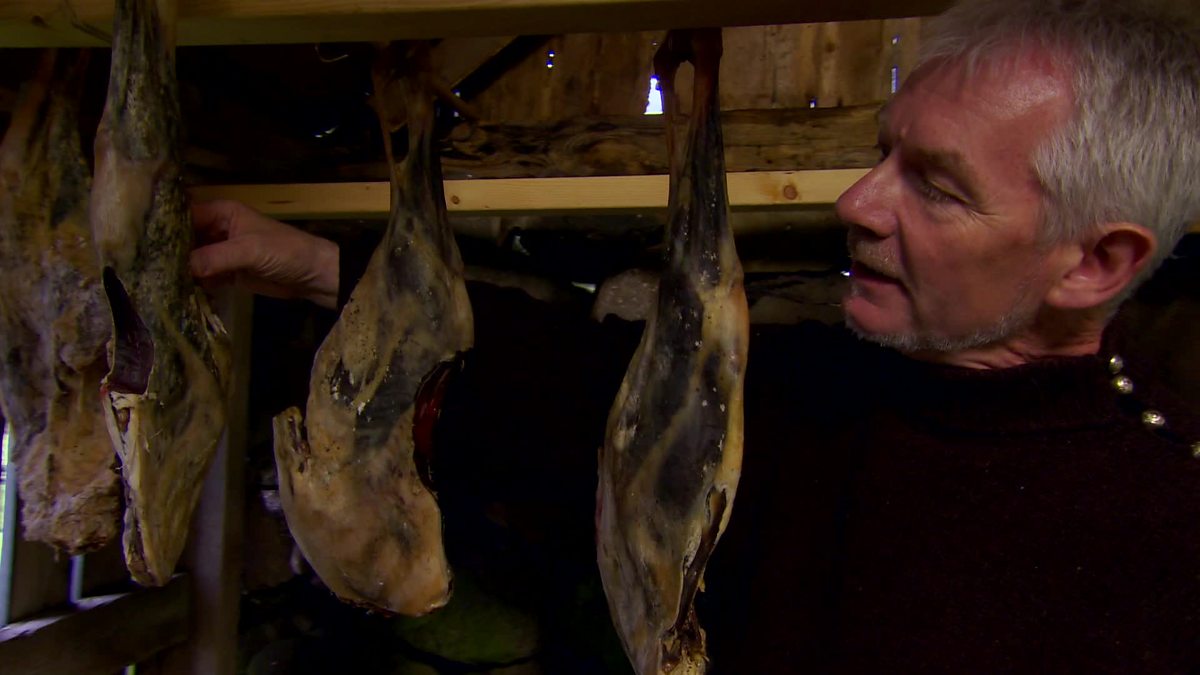 Nick Crane braves a Faroese treat, sheep dried in the salty sea air for up to 9 months.