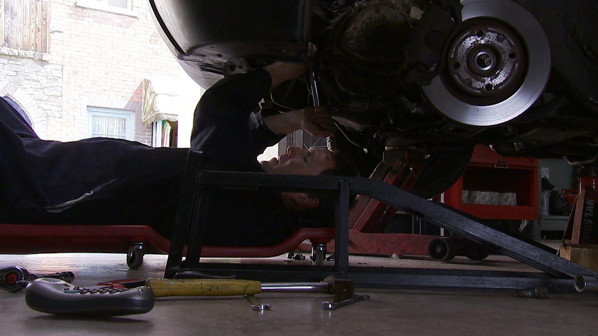 Mae Garry'n cael damwain ddifrifol yn y garej ond a fydd rhywun yn dod i'w helpu mewn da bryd? Garry has a serious accident in the garage but will someone find him and call for help in time?