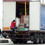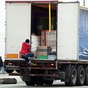 (Photo: A migrant steps onto a truck going to Britain Credit: AFP/Getty Images)