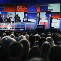 Photo: Guests watch Republican presidential candidates speak during the first Republican presidential debate hosted by Fox News and Facebook in Cleveland, Ohio. Credit: Scott Olson/Getty Images