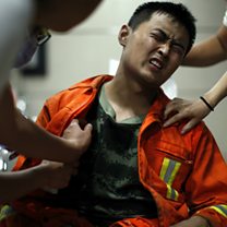 (Photo: An injured firefighter in hospital in Tianjin. Credit: Chinatopix via AP)
