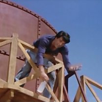 Veeru threatens to jump off a water tank after his proposal is spurned by Basanti's aunty