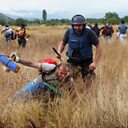 (PHOTO: Migrant trying to avoid Macedonian policeman on the Greek border. Credit: Getty Images.)