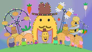 Mae Peppa a'i theulu yn ymweld â Dinas y Tatws, parc newydd sydd â thema llysiau. Peppa...