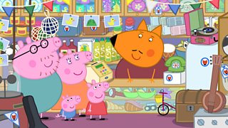 Aiff Peppa a George i siop Mistar Llwynog i brynu anrheg pen-blwydd priodas i Nain a Ta...
