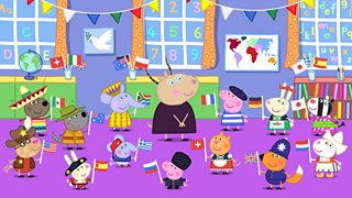 Mae Peppa a'i ffrindiau'n gwisgo i fyny mewn dillad o wahanol wledydd, ond cyn hir mae ...