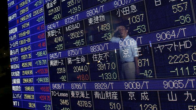 (Photo: A man is reflected on a display showing stock quotation board outside a brokerage in Tokyo. Credit: Reuters)