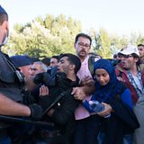 (Picture: Police try to hold back migrants who have refused to travel to the Roszke registration centre and have ran onto the nearby motorway on 7th September in Hungary. Credit: Matt Cardy/Getty Images)