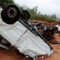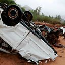 (Photo: The twisted wreckage of two vans that were washed away in a flash flood with women and children inside, Credit: Getty Images)