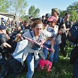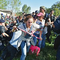 (Photo: Migrants force their way through police lines at Tovarnik station to board a train bound for Zagreb, Credit: Getty Images)