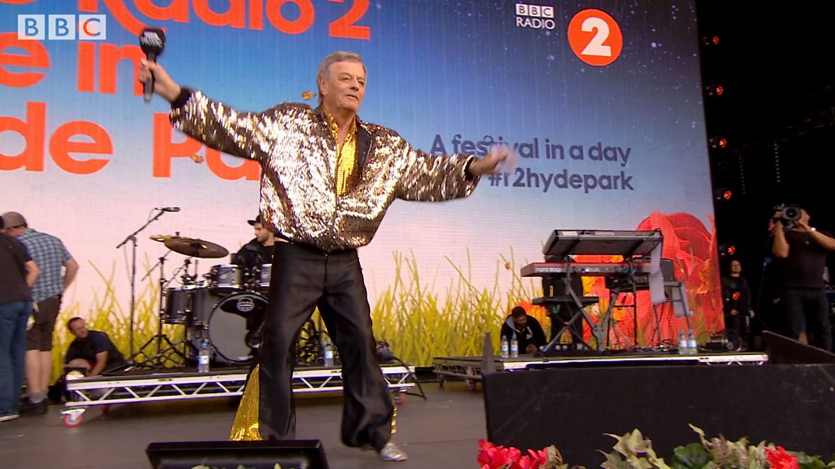 The Pick of the Pops presenter entertains the crowd during Radio 2 Live in Hyde Park.