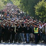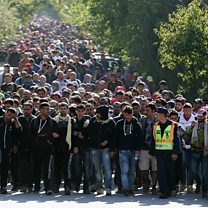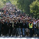 (Picture: Migrants who arrived on the third train today, at Hegyeshalom on the Hungarian and Austrian border, walk the four kilometres into Austria. Credit: Getty Images)