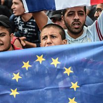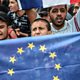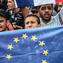 (Photo: A migrant holds a European Union flag as migrants and refugees stage a demonstration at Istanbul's Esenler Bus Terminal. Credit: AFP/Getty Images)