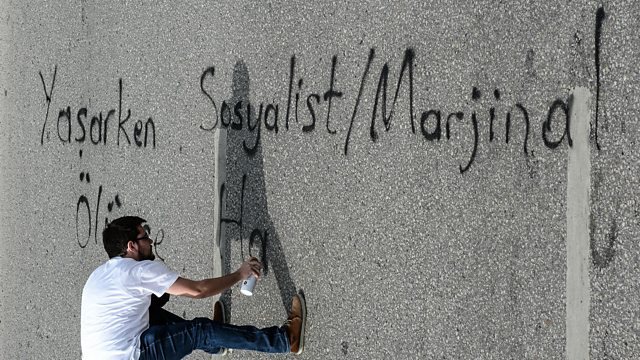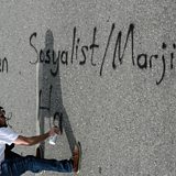 (Photo: A protester writes on the road in Turkish as he and others gathers during a commemoration of the Saturday's bomb blast in Ankara, Turkey, 2015. Credit: Getty Images)