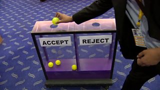 Tory delegates were asked to vote in or out of the EU in the Daily Politics mood box.