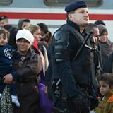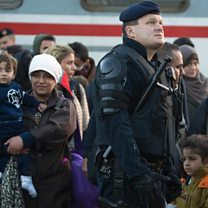 (Photo: A Croatian police officer assists migrants to board a bus in Cakovec, near the Croatian-Slovenian border. Credit: AP)