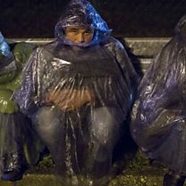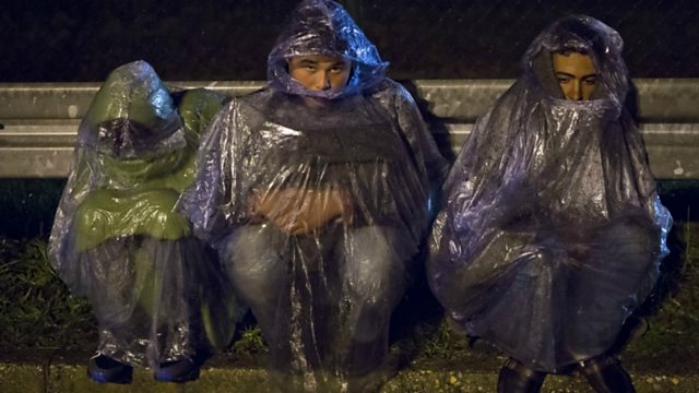 (Photo: Migrants sit in the rain as they and hundreds of others are prevented from crossing into Slovenia, at a border crossing with Croatia. Credit: AP)