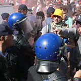 (Picture: Protesting university students clash with riot police outside Parliament in Cape Town. Credit: AP)