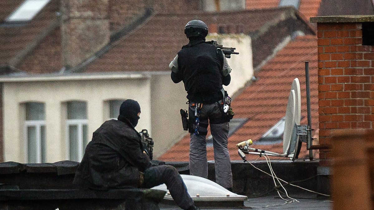 (Photo: Special force officers stand guard on a roof top near the scene of police raids in the district of Molenbeek, Brussels. Credit: AFP/Getty Images)