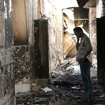 (Photo: An MSF employee walks inside the charred remains of their hospital after it was hit by a U.S. airstrike in Kunduz, Afghanistan. Credit: AP)