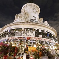 A memorial service is being held in Paris for the 130 victims who died two weeks ago. Also in the programme, can France put together a coalition of fight the so-called Islamic State; and after Kenya, Pope Francis heads for Uganda. (Photo: Candles, flowers and messages are seen at the statue at the Place de la Republique, Paris, to pay tribute to victims of the attacks. Credit: Reuters.)