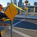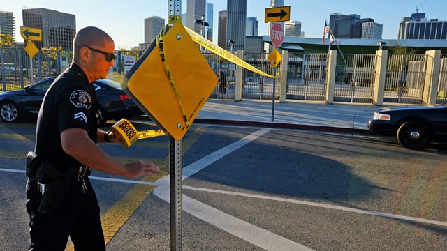 (Photo: A police officer puts up yellow tape to close a school in Los Angeles. Credit: AP)