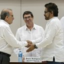 (Photo: Colombian government and FARC negotiators shake hands in Havana. Credit: AP)