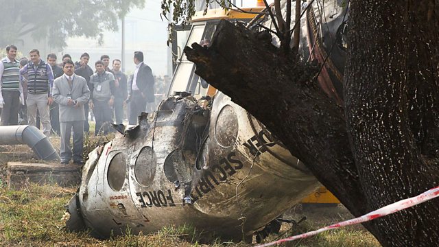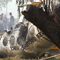 (Photo: Indian investigators look at the remains of a small Indian paramilitary plane that crashed outside the airport in New Delhi. Credit: Manish Swarup/AP)