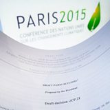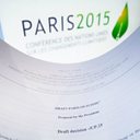 (Photo: An illustration picture showing a draft for the outcome of the COP21 conference on climate change next to the logo of the summit. Credit: AFP)