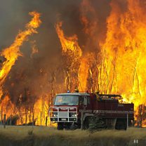(Photo: A fire truck moves away from out of control bushfire flames. Credit: Associated Press)