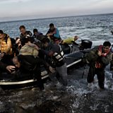 (Photo: Refugees and migrants jump off a dinghy upon their arrival on the Greek island of Lesbos after crossing the Aegean Sea from Turkey. Credit: Aris Messinis/AFP/Getty)