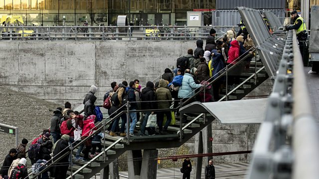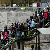 (Picture: Line of refugees on the stairway leading up from the trains arriving from Denmark to Malmo. Credit Reuters)
