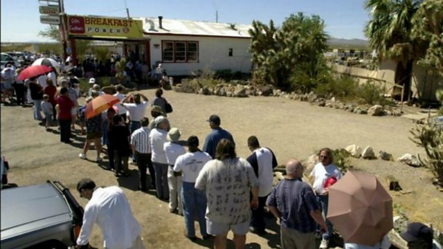 (Photo: People queuing for Powerball lottery tickets on the state line between Arizona and Nevada. Credit: AP)