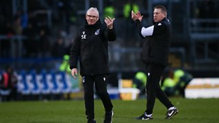 Steve Evans talks to Ed Hadwin after Bristol Rovers 3-2 victory at Harrogate Town.