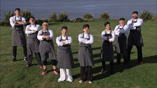 Mae'r sialens gyntaf yn cael ei datgelu - paratoi pryd o fwyd i tua 100 o ffermwyr ifan...