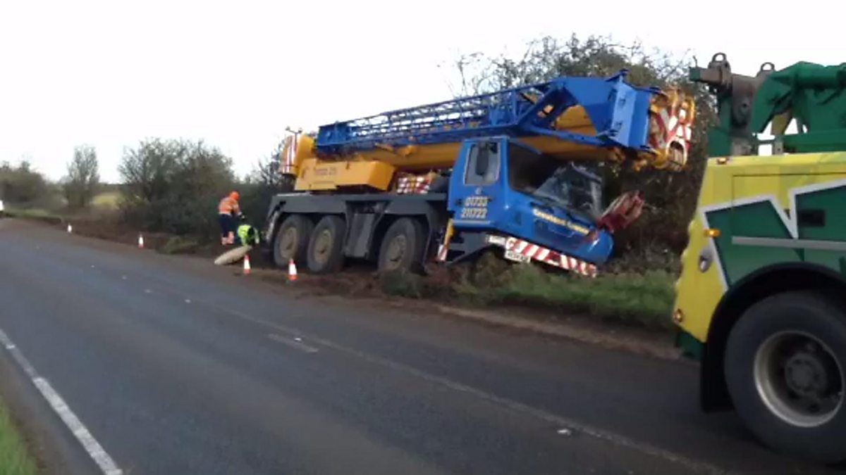 A mobile crane has crashed in a ditch on the A1088, near Woolpit.