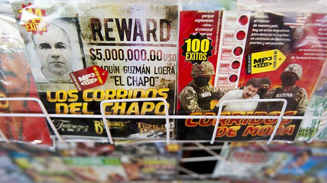 (Photo: MP3 audio covers of "narco-corridos" on the escape and recapture of Joaquin "El Chapo" Guzman, on display at a market in Monterrey, Mexico. Credit: AFP/Getty Images)