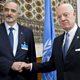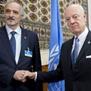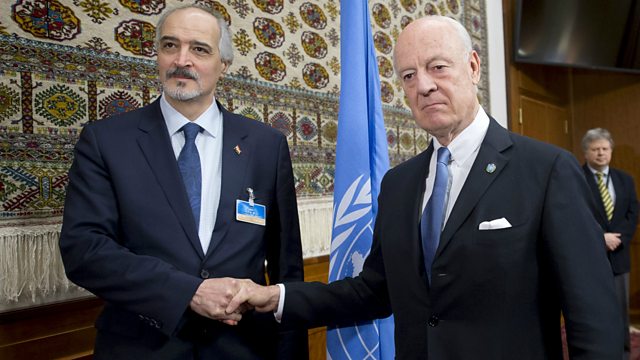 Our Arab Affairs correspondent Alan Johnson tells us who is at the Syria talks, Daughter of Maoist cult leader speaks, Last Land Rover produced (Photo: U.N. envoy Staffan de Mistura shakes hands with Syria"s Ambassador to UN Bashar al Jaafari during the Syria peace talks in Geneva, Switzerland. Credit: REU)