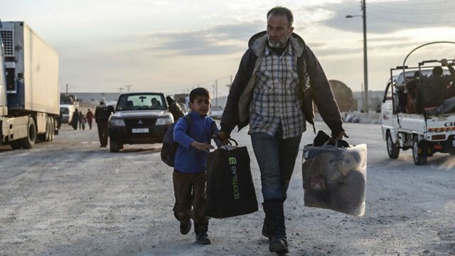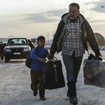 Photo: A man and a child fleeing the city of Aleppo near the Turkish border