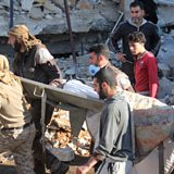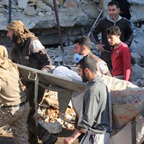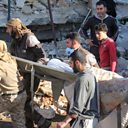 (Photo: People carry a stretcher after a hospital supported by Doctors Without Borders was hit by suspected Russian air strikes in Syria"s northern province of Idlib)