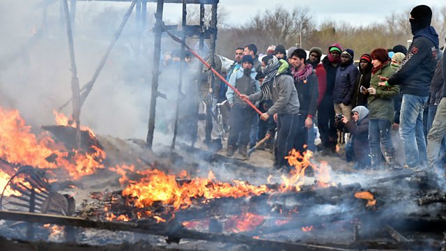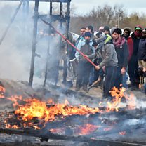 (Photo: Migrants try to extinguish a fire during the dismantling of half of the "Jungle" migrant camp in the French northern port city of Calais. Credit: AFP)