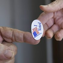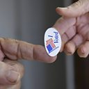(Photo: Poll worker hands a sticker to a voter on Super Tuesday in Stillwater, Oklahoma. Credit REUTERS.)