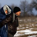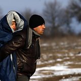 (Photo: A migrant carrying a child walks from the Macedonian border into Serbia. Credit:AP)