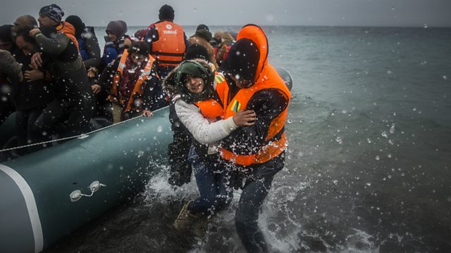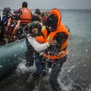 (Photo: Refugees and migrants leave a dinghy on a beach on Lesbos, Greece.