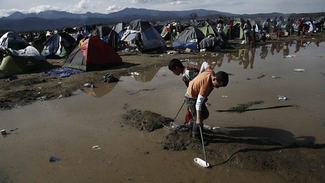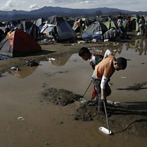 (Photo: Migrant children play in water, following overnight storm at Idomeni refugee camp, near the Greek border with Macedonia. Credit: EPA)