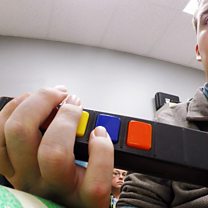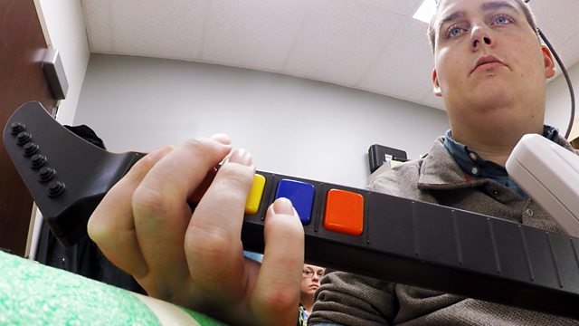 (Photo: Ian Burkhart playing a guitar video game after regaining the use of his hand. Credit: AFP/Getty)