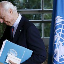 Photograph shows U.N. mediator Staffan de Mistura leaves a news conference after a meeting with the High Negotiations Committee (HNC) during Syria peace talks at the United Nations in Geneva. (Credit: Reuters)