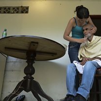Photograph shows an Alzheimer's patient is shaved by his daughter, 2014. (Credit: RAUL ARBOLEDA/AFP/Getty Images)